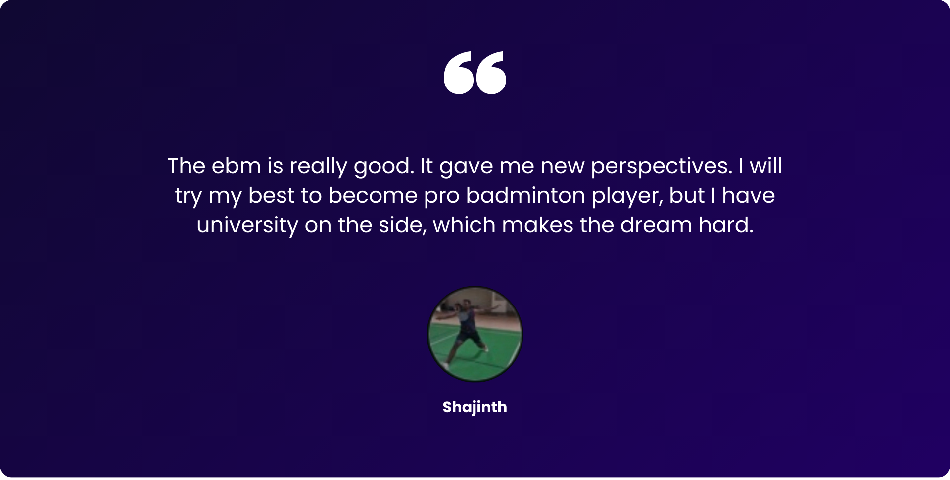 EBM = Enhanced Badminton Mastery - a complete step-by-step system to take a badminton player from where they are now to an elite level (mindset, technique, physical training, badminton IQ/tactics, and exposure/career strategy)