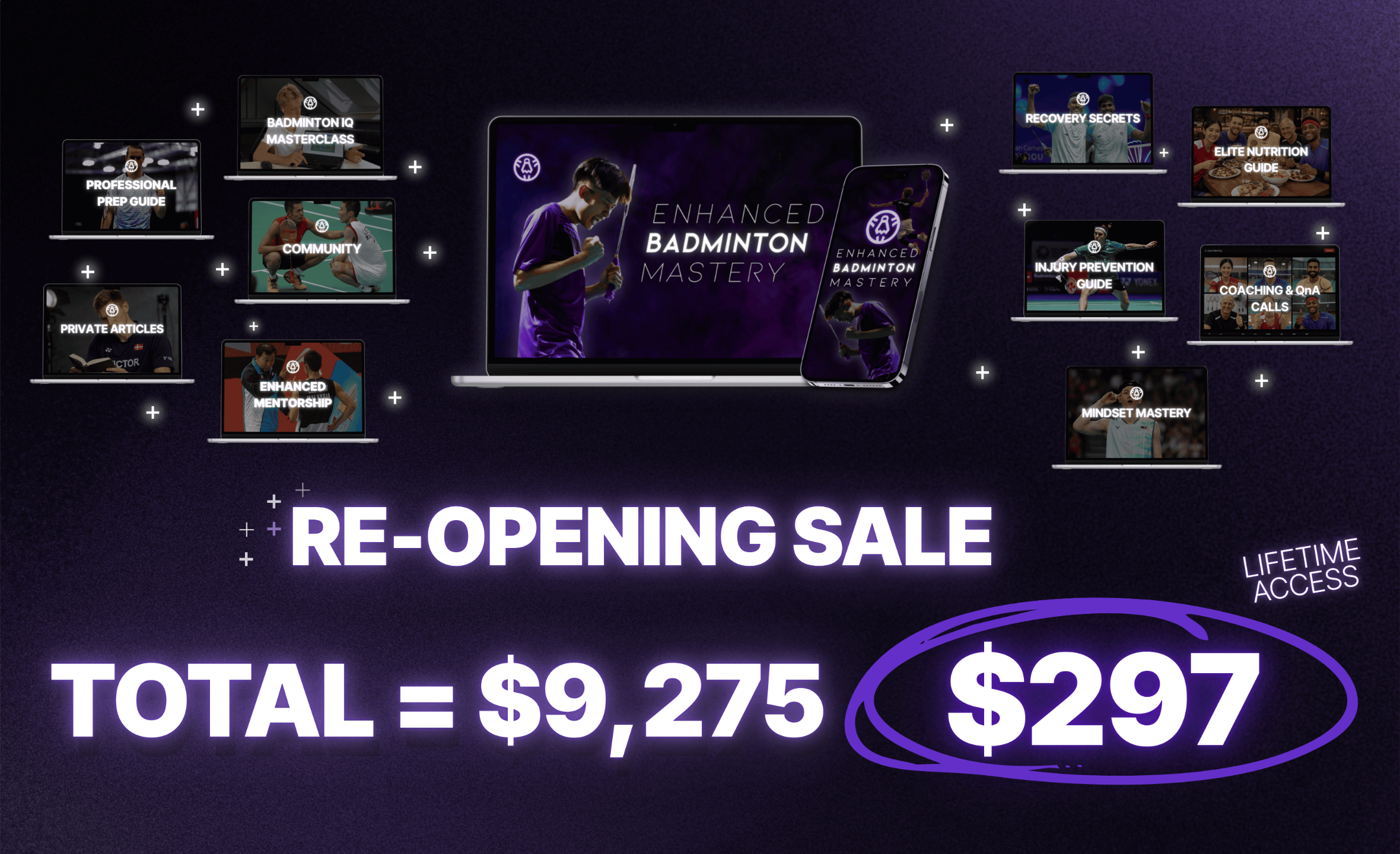 Enhanced Badminton Mastery is for anyone who wants to reach the next level with their badminton ability. Elite level coaching, mentorship, opportunities and more for your entire career. Today for just $297! (Normally $997). Offer expires as we get 100 more players inside.